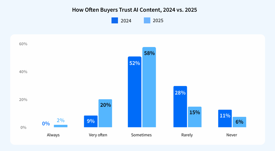- 80% of buyers now trust AI-generated content at least sometimes, a 19% year-over-year increase that signals growing acceptance of AI-mediated information gathering.