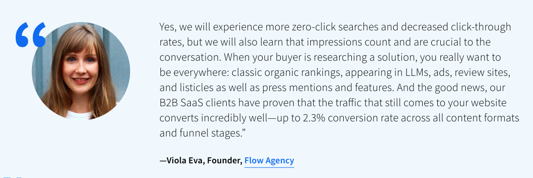 With AI-mediated search disrupting traditional SEO, successful visibility requires a three-pronged approach: (1) Optimise for citation in AI Overviews by creating authoritative, verification-worthy content, (2) Distribute intelligence across multiple channels where verification occurs (especially review platforms, used by 77% of high-performing vendors), and (3) Focus on quality engagement metrics rather than raw traffic, as the research shows converted traffic quality is increasing even as volume decreases.